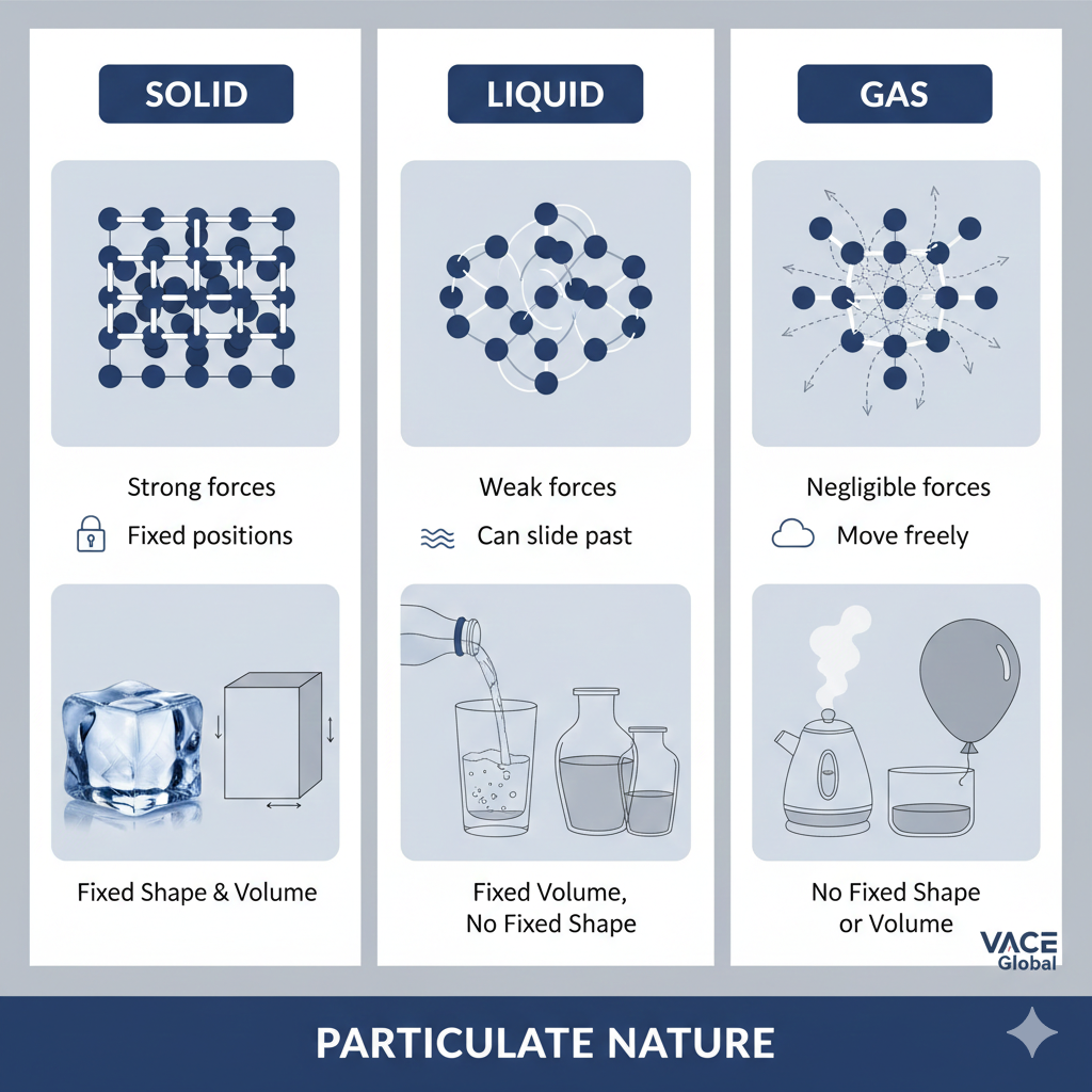 In solids, particles are packed very closely together. They cannot move freely, so they vibrate in fixed positions. This close arrangement is why solids have a definite shape and volume, and why they are not easily compressed. - Liquids:
